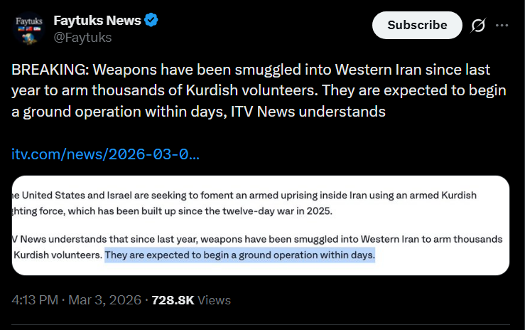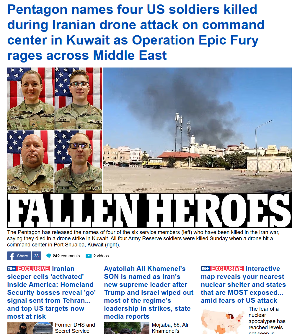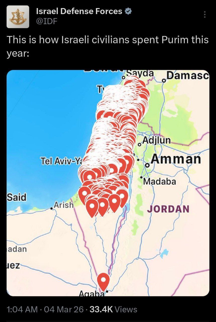 >By posting in these threads, you recognize Israel controls the US Military, America is the global vector for degeneracy, and you denounce the Talmud.Previous: >>529787227▶Day 4:>US embassy in Dubai hit, rockets in Tel Aviv>US offers insurance on ships in Hormuz>IDF tanks damaged in south Lebanon>possible Syrian buildup on Lebanese border>Kurdish militias might enter the chat▶Day 3:>Hormuz straight still closed>Iranians A/D still active>Iranian drones and missiles still launching>Al-Manar goes dark>IOF war criminals bombs IRIB▶Day 2:>IDF issues evacuation orders to southern Lebanon, Al Manar in Beirut and IRIB in Teheran>IRGC says that the Strait of Hormuz has been closed and that Iran will set fire to any ship trying to pass>Qatar downed 2 Iranian Su-24 aircraft, the Qatari Defense Ministry says>QatarEnergy, accounting for 20% of global LNG trade, stops all production after attacks on its facilities>IDF says Iran is moving from isolated launches to larger missile barrages>Iran strikes Saudi oil infrastructure, including ARAMCO Ras Tanura facility>3 x U.S. F-15E fighter jets were shot down over Kuwait in a FF incident, all crew members ejected safely and are in stable condition - CENTCOM>Iranian drones strike U.K.'s airbase RAF Aktoriri in Cyprus>De-facto Iranian leader Ali Larijani says: "We will not negotiate with the United States">Hezbollah joins the war, Israel retaliates with airstrikes on Beirut; does not rule out invasion▶Livestreamshttps://www.youtube.com/watch?v=wWbHTA2dJY8▶Iran state media (yes, it’s still broadcasting live)News channel: https://www.aparatchi.com/iran-live-tv/farsi-irib-tv/shabakeh-khabar-liveChannel list: https://www.aparatchi.com/iran-live-tv/farsi-irib-tv▶Telegramhttps://rentry.org/tgnews▶Twitter accounts:https://nitter.net/clashreporthttps://nitter.net/FaytuksNetwork▶Air Traffichttps://www.flightradar24.com/▶Maritime Traffichttps://www.marinetraffic.com/