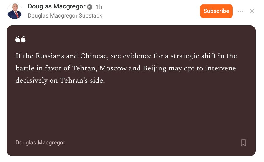 Col Douglas Macgregor: IRAN WAR U.S. Losing Position in the Worldhttps://www.youtube.com/watch?v=zGa_x6Is4QE