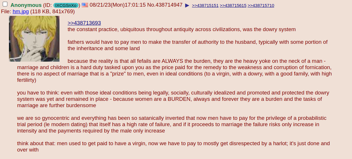 >>529832947I am really not a fan of people arguing with>Uhh, it's just naturebecause that argument is only ever used to excuse women's behavior.If we drop all of civilization's rules and everyone just acts based on their nature, I can assure you women would not like the outcome, and they would not get their dual mating strategy.They aren't dumb animals, even when they love to pretend they are. They can be fully expected to keep their shit in line and not do horrendously evil things just because they think they could get away with it.Although it was definitely a massive mistake of suspending social expulsion as a consequence. People in general tend to have poor self-control, so it's easier for them to keep their shit in check when the consequences are guaranteed and severe.Especially nowadays with paternity tests it would be easy. Mandatory at birth, problem solved. The reason it's not being done isn't nature, but because civilization has become excessively misandrist, to the point it gets the kicks out of tricking a man into raising someone else's cuckspawn.