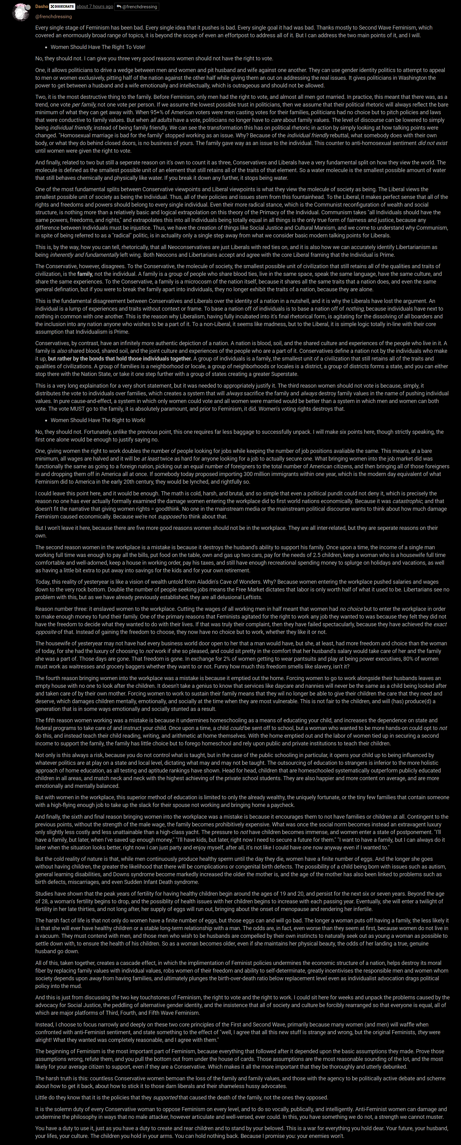 Stuck in HS mentally. Not everything is an "own" and argumentation can be things other than namecalling, memeflaggot glownigger.