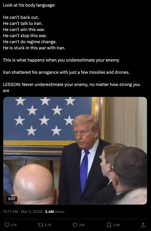 >>529816644He thought he could pull off a better Ukraine than Putin since Venezuela sort of went okay and was also emboldened by ICE taking over Dem states, but he bit off more than he can chew by underestimating sandniggers and just created an Afghanistan 2.0. I predict he will look for any excuse to claim "mission accomplished" and gtfo. Maybe he'll set up JD or Rubio as the fall guy. Let's see.