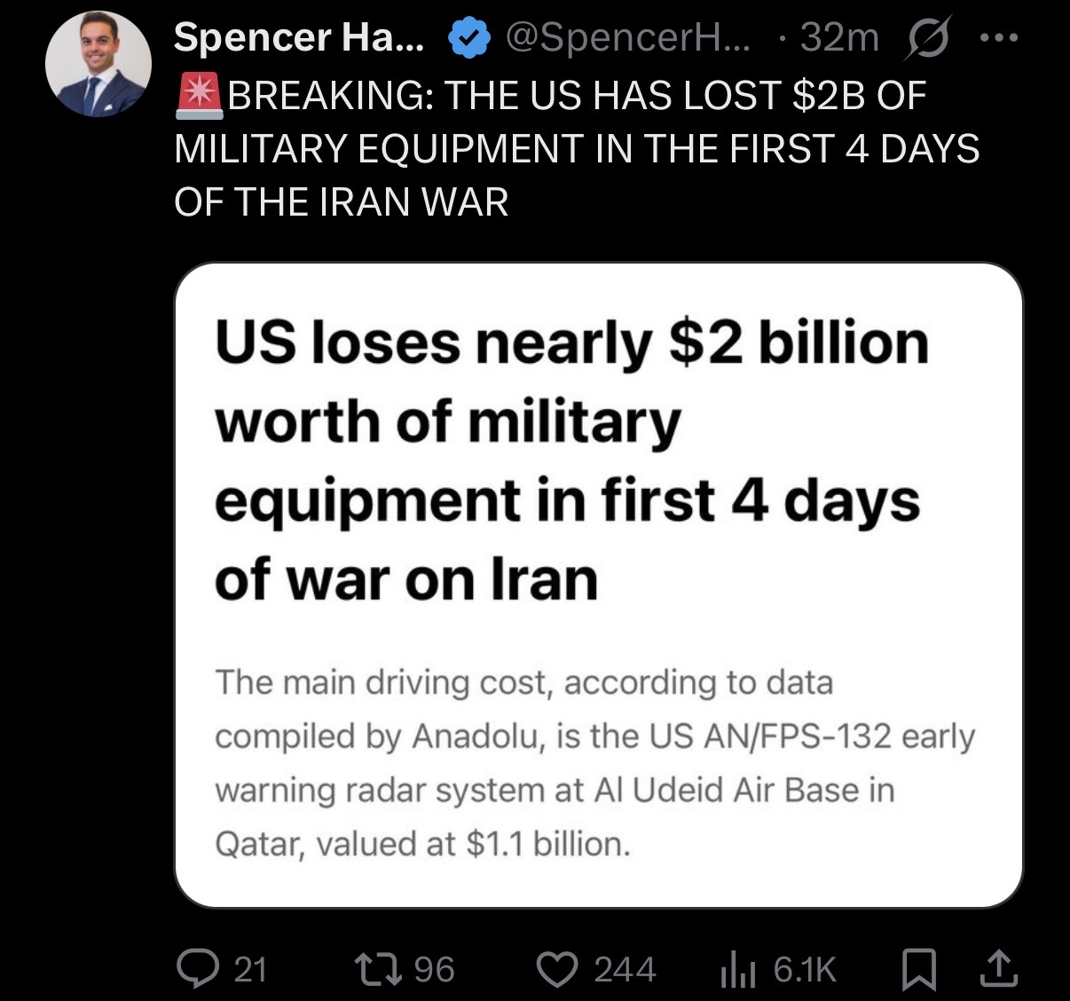 >>529820457It's a lot more than that. The standoff munitions, the interceptors, the fuel. That list was just the hardware the Iranians (or Kuwaitis) blew up.We're into the tens of billions by now in total.