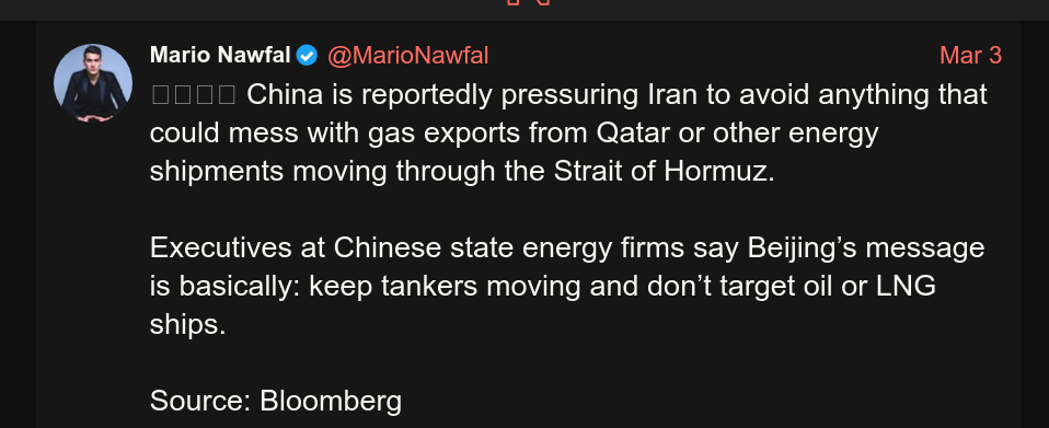 China doesn't have allies or friends. They only have interests:>Another example of what happens when you ally with China. >If your only path to victory inconveniences them, they will throw you under the bus.https://x.com/johnrobb/status/2028872821913403844