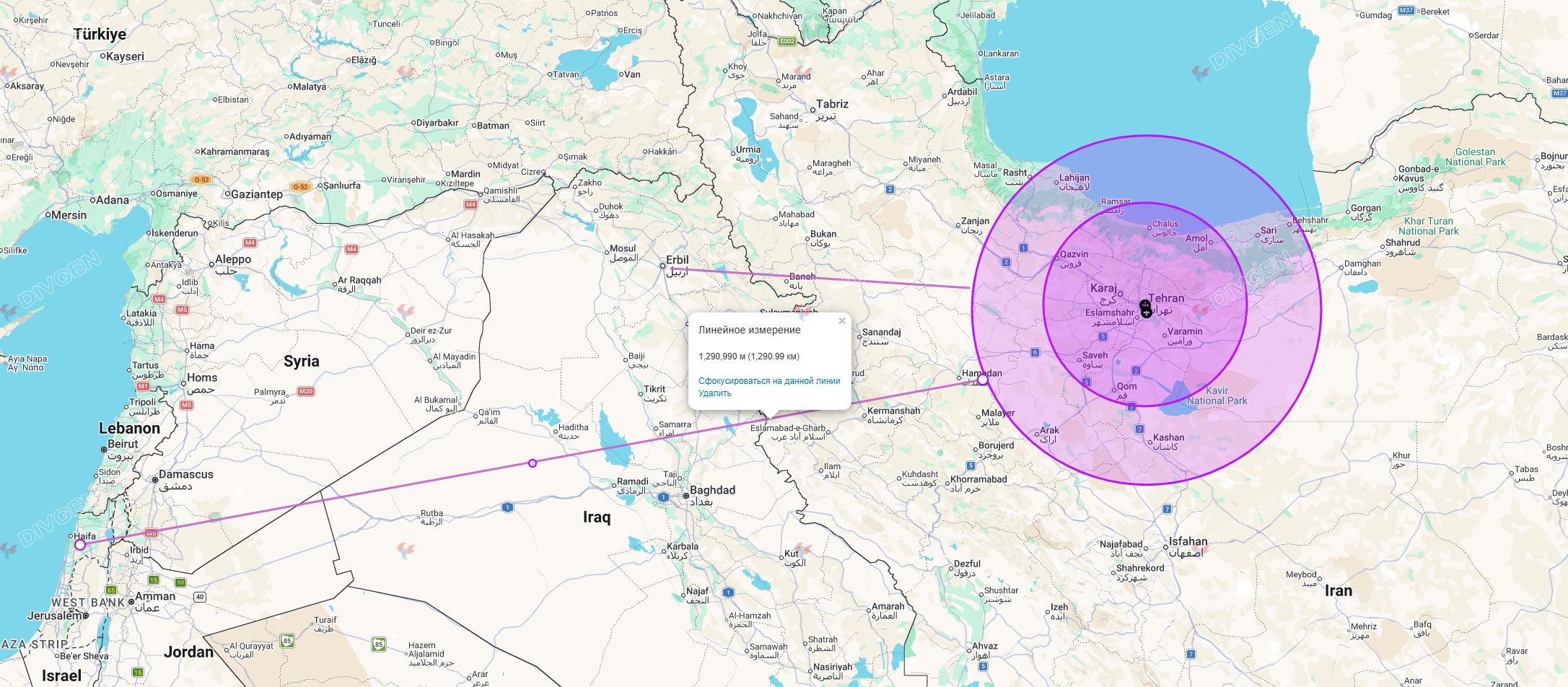 >>529829489Here's a quick and dirty mockupSmall circle is 100km area around Tehran, large circle is 240km from Tehran. The missile was most likely fired somewhere within the 240km circle.Distance from Erbil to the edge of the large circle is around 400km, and distance from Israel is around 1200km. That's assuming they came from that direction.