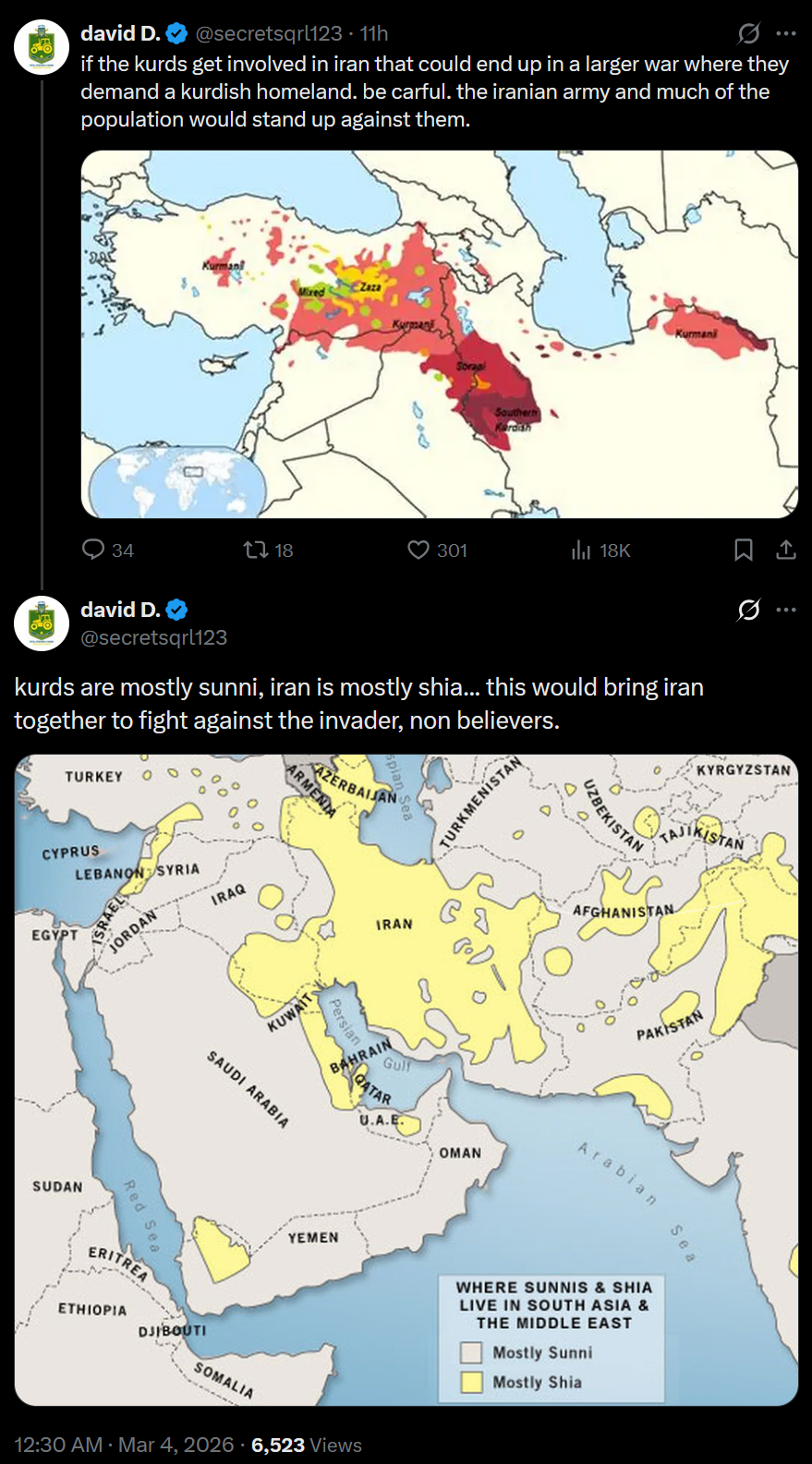 >if the kurds get involved in iran that could end up in a larger war where they demand a kurdish homeland. be carful. the iranian army and much of the population would stand up against them.>kurds are mostly sunni, iran is mostly shia... this would bring iran together to fight against the invader, non believers.LOLOL