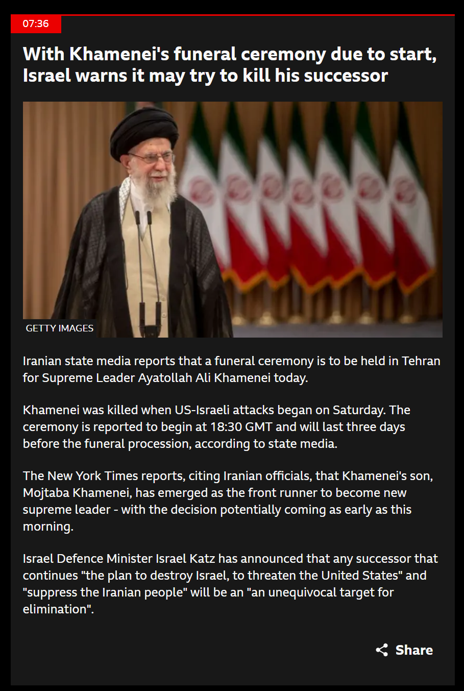 >Iran's Supreme Leader Ayatollah Ali Khamenei has been killed