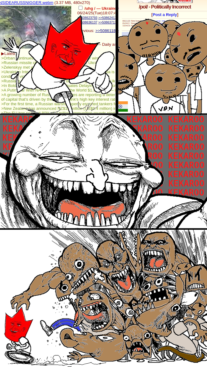 >>529824949>he got fucking sent into the bin of historyi love it and i hope the best for canada fuck the jeet invasionand I do not like that ruskis are stupid enough to die for putinputin is just a front man actor like trump they have nothing to sayi think you are talking about chabad which also controls ukraineonly difference is that ukros are being forced largely and ruskis are not they succesfully psyoped both sites and i don't know why you think i support putin or russians if i just point out facts