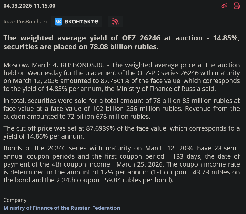 >The oil rally due to the war in Iran will not save the Russian budget>Because of the war in Iran, Brent oil prices have reached $83 per barrel, but this will not help Russia balance its budget, bloated by the costs of the war in Ukraine.>In order for its deficit to reach the planned 3.8 trillion rubles, the average annual export price of Russian Urals oil should be $59 per barrel - the budget is based on this. And for budget revenues to equal expenses, $97 is required, Alfa Bank analysts estimated.>In January, the average price of Urals was $41. The Ministry of Economic Development has not yet summed up the results of February. At the same time, the price of the benchmark Brent spent most of the month in the $60-70 corridor. Due to sanctions, discounts on Russian oil jumped at the end of last year and have not decreased since then: in February they were $27-28.>The oil rally had almost no impact on Urals. On March 2 it cost $46.4, notes the chief economist of Renaissance Capital Andrey Melashchenko. Such Urals quotes “imply that the discount further widened in early March,” he states.>In addition to the huge discounts that Russia is forced to give to oil buyers, budget revenues are being reduced by the strong ruble. The budget was drawn up based on the average annual rate of 92,2 rubles/$, but so far the dollar is cheaper than 80 rubles. As a result, the ruble price of a barrel, which forms oil and gas budget revenues, was less than 3,500 rubles in February. - a third less than the planned 5440 on average for the year. The preliminary estimated ruble tax price of Urals on March 2 was 3,582 rubles. (Urals – $46.4 per barrel; dollar exchange rate – 77,3 rubles), Melashchenko estimates.1/2