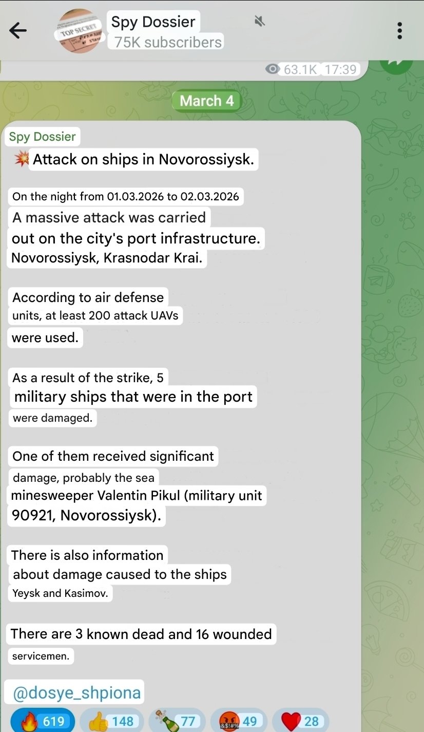 >As a result of the attack on the port in Novorossiysk two days ago, 5 Russian military ships were damaged.>Among them are the "Yessk", "Kasimov" and the mine countermeasures ship "Valentin Picul".>Three military personnel - 200, and 16 - 300.>More than 200 Ukrainian UAVs were in operation.