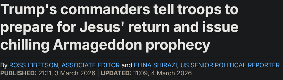 Orangenigger is fucking losing it.>A non-commissioned officer (NCO) wrote to the MRFF Monday that his combat-unit commander had claimed Trump was 'anointed by Jesus to light the signal fire in Iran to cause Armageddon and mark his return to Earth.'>'He urged us to tell our troops that this was “all part of God’s divine plan” and he specifically referenced numerous citations out of the Book of Revelation referring to Armageddon and the imminent return of Jesus Christ,' the NCO said. >The complaints span more than 40 different units across 30 military sites