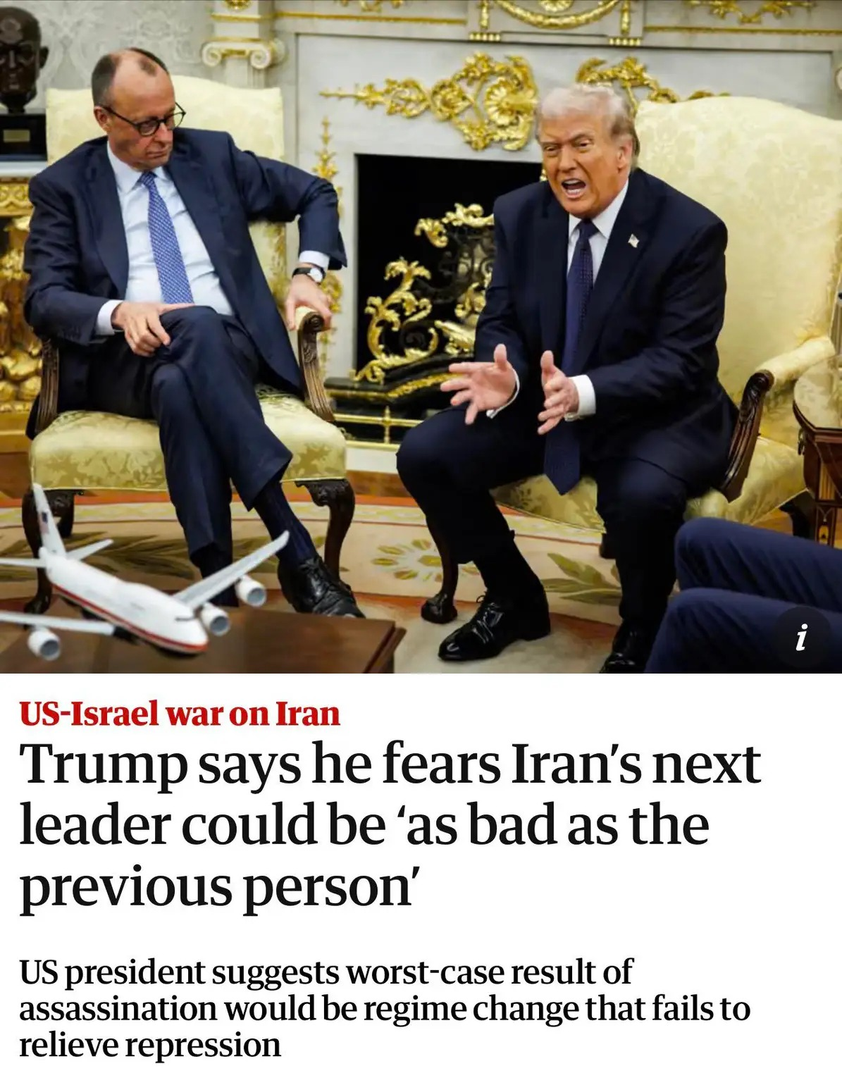 >>529829960>When pressed on his plans for a transition of power, Mr. Trump said he hoped Iran’s military forces would simply turn over their weapons to the people. - NYT
