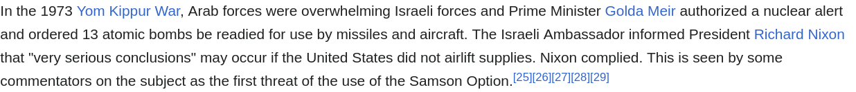 Pic rel.Israel 50 years ago already threatened to use nukes if the US didn't bail them out.Fortunately back then it was low IQ arabs and the US was still worth something.Now it's Persian chads flinging an endless supply of dirt cheap drones from behind their mountains, guided by chinese satellites and russian anti-EW components.The same blackmail will play out again but this time the US can't do shit.Please fren in Europe stay safe.Nuclear war is not the end of the world as long as you know how to shelter and how long to wait out the radiation.We will have a post nuclear wasteland but it will be kike free.