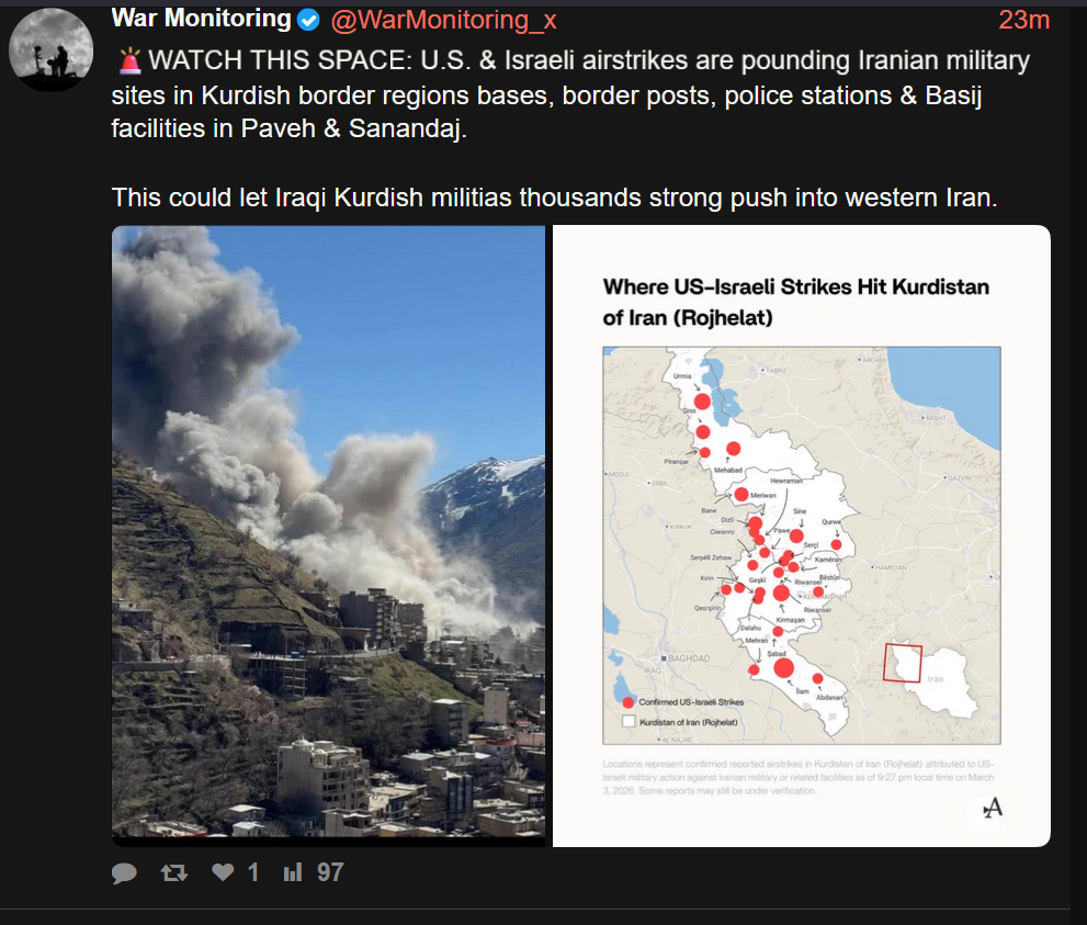 US and Israeli aistrikes show that their genuine plan is a kurdish border incursion.... I fucking can'tThis is what we call an honest signal that they got no plan, no way out and that the global economy is raped.Even if, even if this could work it would take years, YEARS!It will not open the strait of hormuz and it won't even defeat Iran, they fought saddam for nearly a decade with no result.