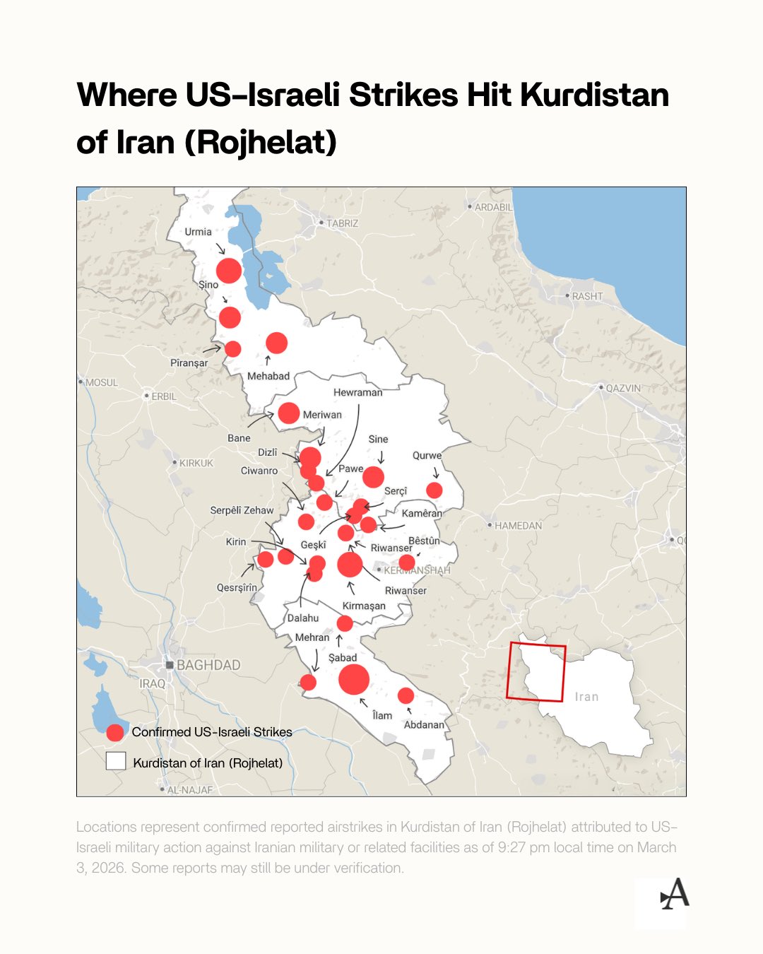 Locations of airstrikes possibly supporting kurdish invasion