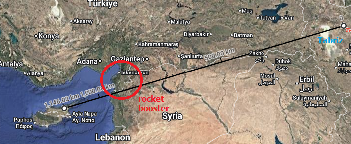 >>529842367There forgive the crudeness I haven't done the autism thing in a whileBut the booster is a Fattah-2 booster. We know this because they launched a whole lot of them during TP-2. The booster fell in the province circled in red. And Cyprus (which we know has been a target) is well within the Fattah-2's stated 1400km range. And the earth is round. So the ballistic arc would line up perfectly to where the booster was found. It was very obviously being fired at Cyprus.