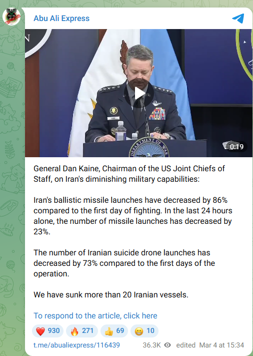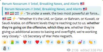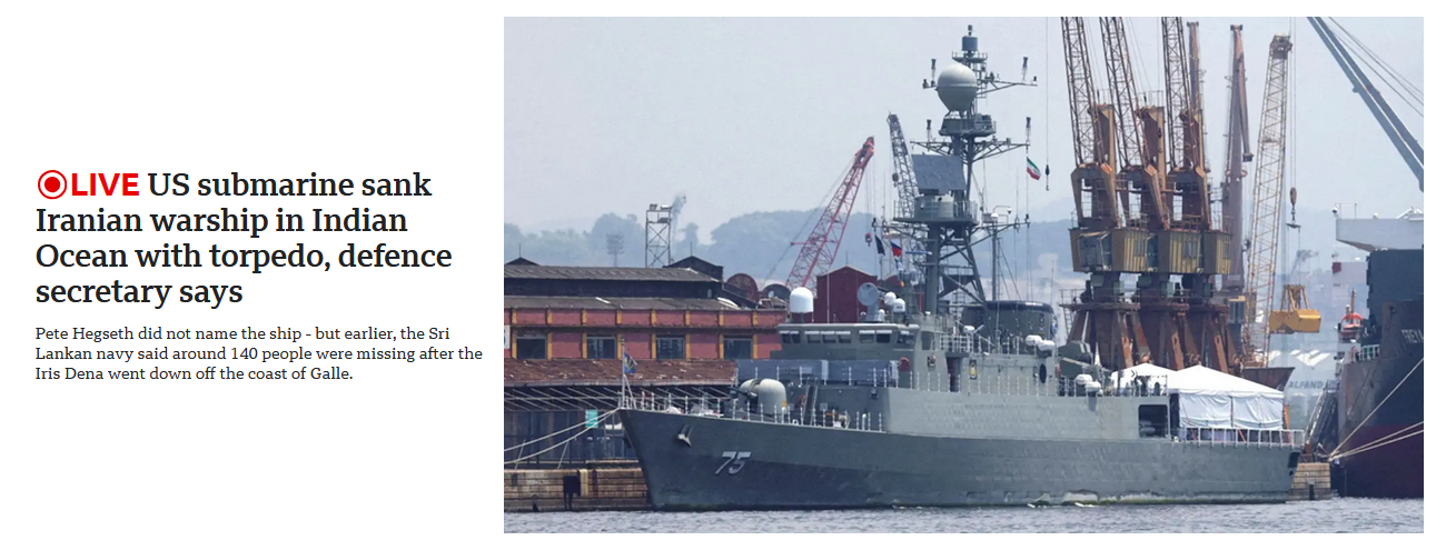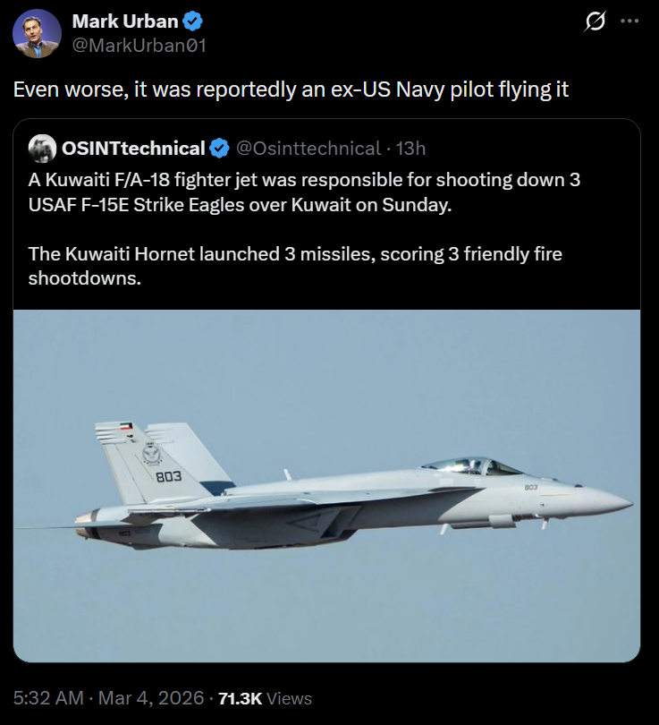 Previous: >>529839841Timeline▶Day: 5>QatarEnergy declares force majeure on LNG shipments>Turkey says an Iranian missile was fired at Turkey>Farewell ceremony for Iran's Khamenei postponed>Iran to elect Khamenei's son as new leader – Reuters>No supply disruption at Saudi Aramco complex – Reuters>Panic in Lebanon, as IDF ground forces advance at least one kilometer across 7 different positions – Al Jazeera>Syria closes border with Lebanon>IDF issues blanket evacuation warning for all communities south of the Litani river>IAF claims it shot down iranian YAK-130, scoring first F-35 kill – Jerusalem Post>Iran claims it shot down US F-15 – Tasnim, Iranian state media>Iranian ship sinking off the coast of Sri Lanka after submarine attack, at least 100 missing – Reuters>Asian markets tumble amid Iran war – Bloomberg>Iran has struck at least 11 U.S. military facilities since Saturday – NYT>CENTCOM claims to have sunk 17 Iranian ships and a submarine in the Gulf of Oman>At least one Gulf country is close to running out of AD systems - CNN>Tehran is currently facing the heaviest bombardment of the war so far - Al Jazeera>CIA armed Kurdish forces to start an uprising in Iran - CNN▶Livestreamshttps://www.youtube.com/watch?v=4E-iFtUM2kk https://www.youtube.com/watch?v=JHwwZRH2wz8 ▶Telegramhttps://rentry.org/tgnews▶Twitter accounts (using proxy frontend because twitter's UI is trash):https://nitter.net/clashreporthttps://nitter.net/FaytuksNetworkhttps://nitter.net/sentdefender▶Israel Rocket Alertshttps://www.tzevaadom.co.il/en/▶Air Traffichttps://www.flightradar24.com/https://flightaware.com/livehttps://globe.adsbexchange.com▶Maritime Traffichttps://www.marinetraffic.com/https://www.vesselfinder.com/Note: /pig/ is a pro happening thread (both TKD and TMD), this is neither pro-Iran nor pro-Israeli, avoid splitting like the autists of /uhg/ & /chug/.