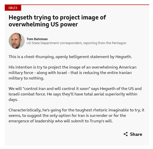 >>529847191US released footafe of US sub sinming an Iran ship. See: >>529845444Also Hegseth press conference. Very optimistic, predict air superiority within a week if start of hostilities