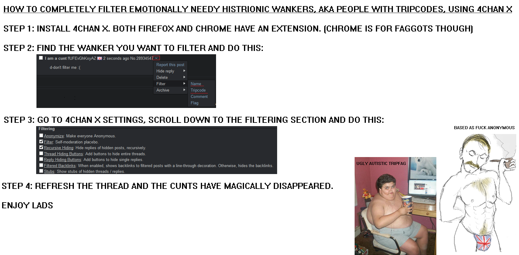 >Some random tripfag on /pol/ making retards mad>This somehow warrants a threadTripfags come and go and nobody should give a shit. Might as well be mad about manlytears or any of the old tripfags that came and went with the years.Sage.