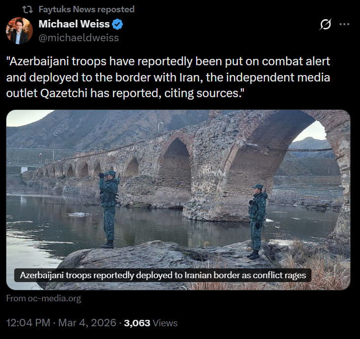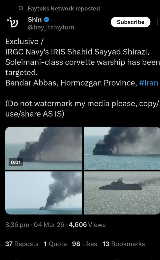 Previous: >>529856697Timeline▶Day: 5>Iranian frigate "Dana" has sunk after being torpedoed by a U.S. submarine in the Indian Ocean>Ballistic missile targeting NATO Incirlik Air Base in Turkey, which stores ~50 B-61 nuclear bombs—intercepted by U.S. destroyer>IDF orders the evacuation of all Lebanese towns south of the Litani river as Israeli forces advance into Lebanon>CENTCOM has sunk 20 Iranian warships and a submarine in the Gulf of Oman — Statement>At least one Gulf country is close to running out of AD systems - CNN>Tehran is currently facing the heaviest bombardment of the war so far>CIA armed Kurdish forces to start an uprising in Iran - CNN▶Livestreamshttps://www.youtube.com/watch?v=4E-iFtUM2kkhttps://www.youtube.com/watch?v=JHwwZRH2wz8▶Telegramhttps://rentry.org/tgnews▶Twitter accounts (using proxy frontend because twitter's UI is trash):https://nitter.net/clashreporthttps://nitter.net/FaytuksNetworkhttps://nitter.net/sentdefender▶Israel Rocket Alertshttps://www.tzevaadom.co.il/en/▶Air Traffichttps://www.flightradar24.com/https://flightaware.com/livehttps://globe.adsbexchange.com▶Maritime Traffichttps://www.marinetraffic.com/https://www.vesselfinder.com/▶Thread Theme: https://www.youtube.com/watch?v=X2WH8mHJnhMNote: /pig/ is a pro happening thread (both TKD and TMD), this is neither pro-Iran nor pro-Israeli, avoid splitting like autists of /uhg/ & /chug/.