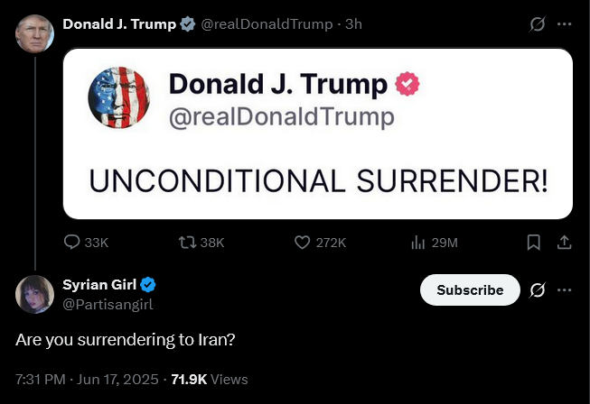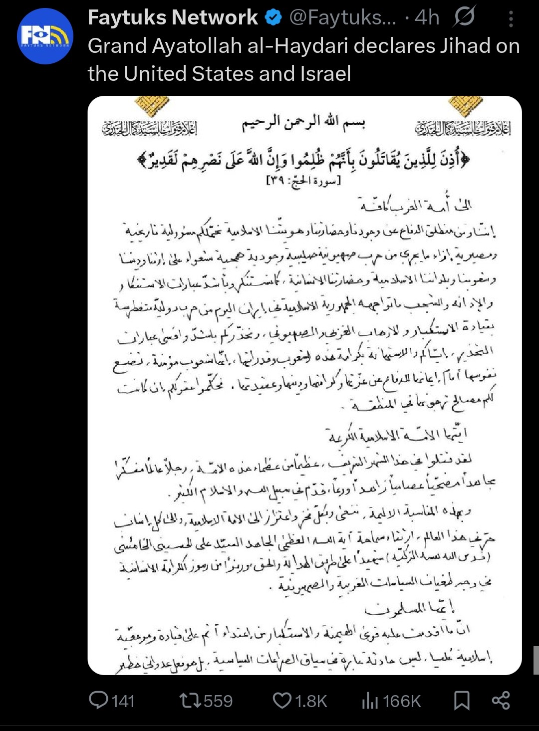 >Iran's Grand Ayatollah Abdollah Javadi Amoli issued a jihad fatwa, declaring that “shedding the blood of Trump and the Zionists is obligatory.”
