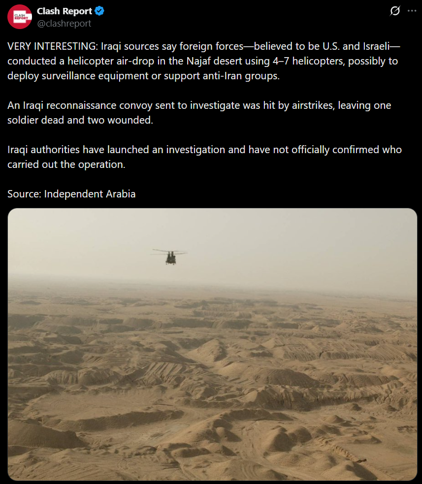 >Special forces have reportedly landed between Al-Bat'ha and Najaf in Iraq, according to some local reports that could not be independently verified.https://nitter.net/FaytuksNetwork/status/2029239673478959112#mPMF about to get their shit pushed in