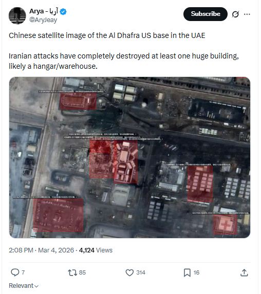 Chinese satellite image of the Al Dhafra US base in the UAEIranian attacks have completely destroyed at least one huge building, likely a hangar/warehouse. March 4th, 2026 https://x.com/AryJeay/status/2029272770362610069