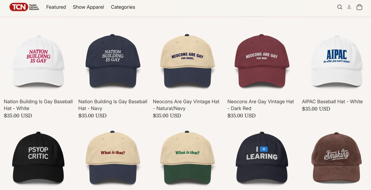 >Tucker Carlson sells MERCH that reads, ‘NATION BUILDING IS GAY,’ ‘NEOCONS ARE GAY FOR ISRAEL’ and ‘AIPAC AN OFFER YOU CAN’T REFUSE’