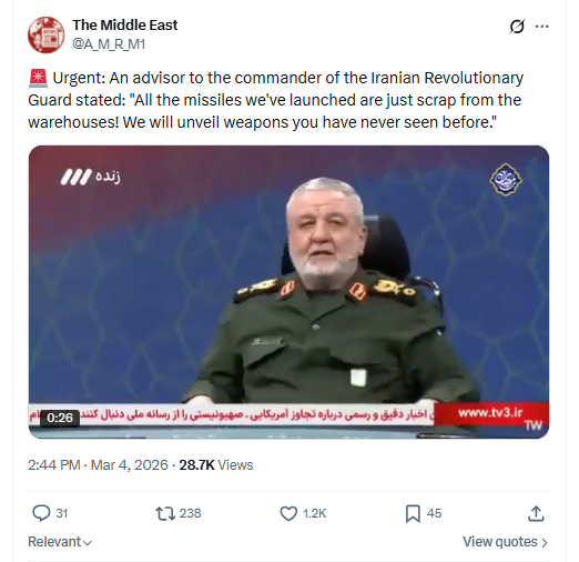 Urgent: An advisor to the commander of the Iranian Revolutionary Guard stated: "All the missiles we've launched are just scrap from the warehouses! We will unveil weapons you have never seen before." March 4th, 2026 https://x.com/A_M_R_M1/status/2029281739281940814 3/4/2026https://files.catbox.moe/1rdil1.mp4