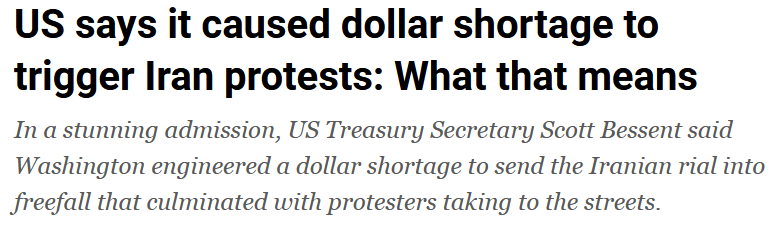 >In a stunning admission, US Treasury Secretary Scott Bessent said Washington engineered a dollar shortage to send the Iranian rial into freefall that culminated with protesters taking to the streets.>United States Treasury Secretary Scott Bessent has claimed that Washington engineered a dollar shortage in Iran to send the rial into freefall and cause protests on the streets.>“What we [have done] at Treasury is created a dollar shortage in the country,” Bessent said, adding that the strategy came to a “grand culmination in December, when one of the largest banks in Iran went under … the Iranian currency went into freefall, inflation exploded, and hence, we have seen the Iranian people out on the street.>“We have seen the Iranian leadership wiring money out of the country like crazy,” Bessent added. “So the rats are leaving the ship, and that is a good sign that they know the end may be near.”>Before this, speaking with Fox News at the World Economic Forum last month in Davos, Bessent explained the role US sanctions played in driving the recent nationwide protests.>“President Trump ordered Treasury … to put maximum pressure on Iran, and it’s worked,” he said. “Because in December, their economy collapsed. They are not able to get imports, and this is why the people took to the streets.”>In both instances, Bessent referred to his earlier remarks at the Economic Club of New York, in March last year, when he outlined how the White House would leverage President Donald Trump’s “maximum pressure” campaign to collapse Iran’s economy.>In his address there, Bessent said the US “elevated a sanctions campaign against [Iran’s] export infrastructure, targeting all stages of Iran’s oil supply chain”, coupled with “vigorous government engagement and private sector outreach” to “close off Iran’s access to the international financial system”.