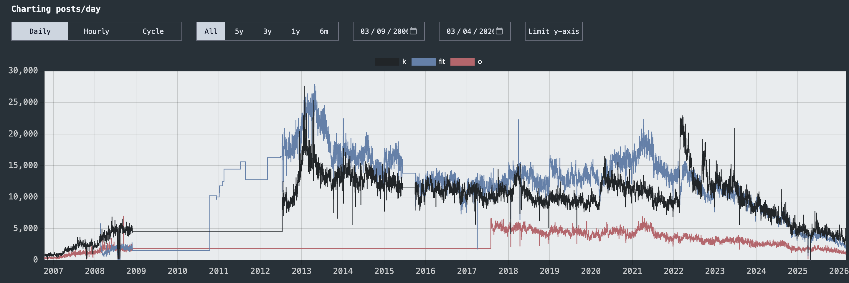 >>529885429>Damn anon, would you like to remind me what happened to infinityGot shot down for cheesy pizza like any alt-chan that doesn't build strong countermeasures against that before even launching.>>529885840Except /k/ still has generals.Their decline in post quantity is mirrored by overall decline in user participation across the whole site and not unique to /k/ because of "muh jannies". Look at the pic. Black line is /k/. You can see a very slow decline since 2013, followed by a spike in 2022, followed by a more rapid decline since that time./fit/, another niche interest board (blue line) follows a very similar pattern and I'm sure you're not going to claim "glownigger jannies are controlling the narrative on creatine".Even /o/ (red) follows a similar pattern despite having much less traffic.The point is the whole site is gradually leaking userbase, most likely to many other alternatives on how to waste time, and not just /k/ specifically.But if you have data to present instead of just vibes then please do so.