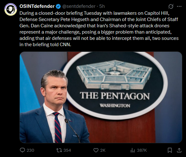 >Top military officials told lawmakers in a closed-door briefing on Tuesday that the US was rapidly depleting its supply of defensive missile interceptors to shoot down Iranian attack drones, even as the Trump administration has publicly dismissed those concerns.>The officials, including the chair of the joint chiefs of staff, Gen Dan Caine, said Iran had been deploying its drones in a way designed to force the US to use its sophisticated Patriot and Thaad interceptors while holding its own high-tech supersonic and ballistic missiles in reserve.>As a result, officials said, the US will soon have to begin prioritising which incoming targets to intercept, according to two people who spoke on condition of anonymity to discuss sensitive details.