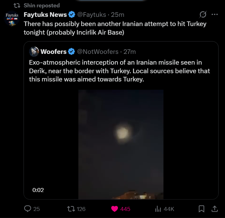 Reports: Iran fired missiles towards the American base "Incirlik" in southern Turkey.Interceptions were heard in the border area with Syria.>Reports: Iran fired missiles towards the American base "Incirlik" in southern Turkey.Interceptions were heard in the border area with Syria.