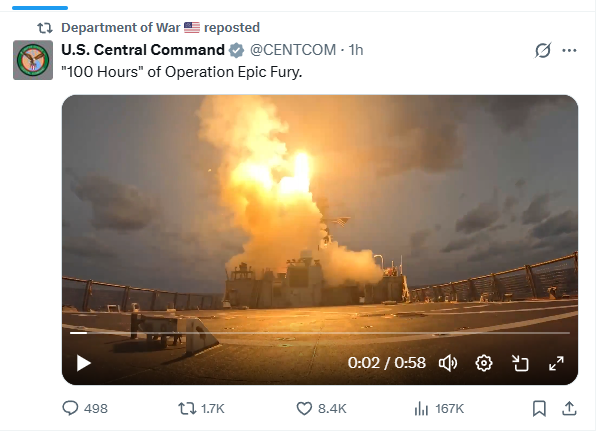 CENTCOM just showed the world what American military power looks like.In LESS THAN 100 HOURS:>50,000 U.S. troops deployed>200 fighter aircraft engaged>2 aircraft carriers in theater>Nearly 2,000 targets struck across 2,000+ missions>B-1 and B-2 bombers delivering surgical strikes.>Iran’s naval capabilities are being dismantled.For the first time in American combat:>Prism systems>One-way attack dronesUnprecedented speed.Unmatched coordination.Overwhelming dominance.God bless our warriors.https://x.com/CENTCOM/status/2029345177819574525