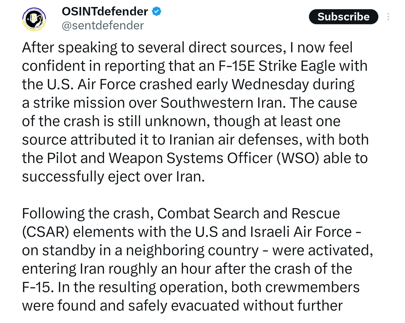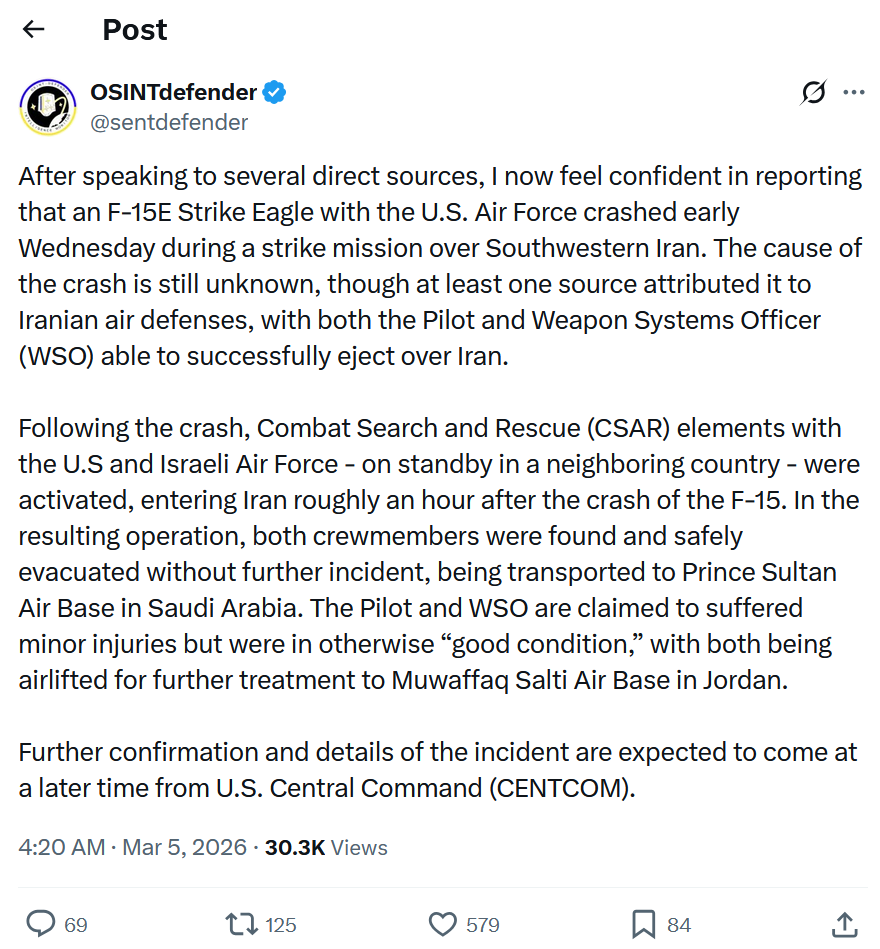 ZOGbros...https://x.com/sentdefender/status/2029411633949262261>After speaking to several direct sources, I now feel confident in reporting that an F-15E Strike Eagle with the U.S. Air Force crashed early Wednesday during a strike mission over Southwestern Iran. The cause of the crash is still unknown, though at least one source attributed it to Iranian air defenses, with both the Pilot and Weapon Systems Officer (WSO) able to successfully eject over Iran. >Following the crash, Combat Search and Rescue (CSAR) elements with the U.S and Israeli Air Force - on standby in a neighboring country - were activated, entering Iran roughly an hour after the crash of the F-15. In the resulting operation, both crewmembers were found and safely evacuated without further incident, being transported to Prince Sultan Air Base in Saudi Arabia. The Pilot and WSO are claimed to suffered minor injuries but were in otherwise “good condition,” with both being airlifted for further treatment to Muwaffaq Salti Air Base in Jordan. >Further confirmation and details of the incident are expected to come at a later time from U.S. Central Command (CENTCOM).
