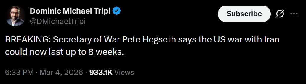 >>529917592>>529917861>4 more weeksLatest is 8 more weeks according to Hegseth.