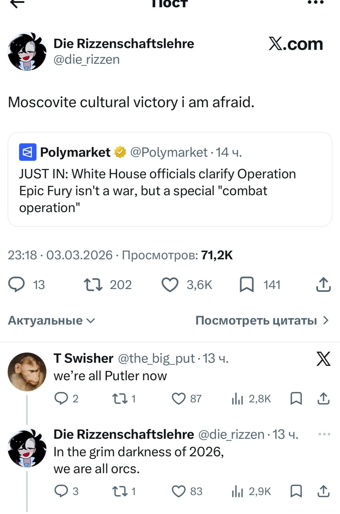 >>529917536OK no worries, I'll look in the archives.I lowkey miss that nigga because he's one of the few shills you could get into a pretty normal conversation if you were just normal to him. Most shills are on a script (whether a programming or metodichka), but he actually felt organic because he could talk about his GF or Japan and you could tell he wasn't a retard (just an ideologue, like the rest of us).BTW, question for you too. What's the meaning of "дoeли" when talking about some media content topic? Is that like "paccocaли" in that the commenters finished talking about all angles of a question?