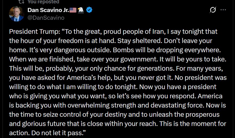 >>5299200006:41 AM · Mar 1, 2026lmaohttps://x.com/DanScavino/status/2027967365359554887