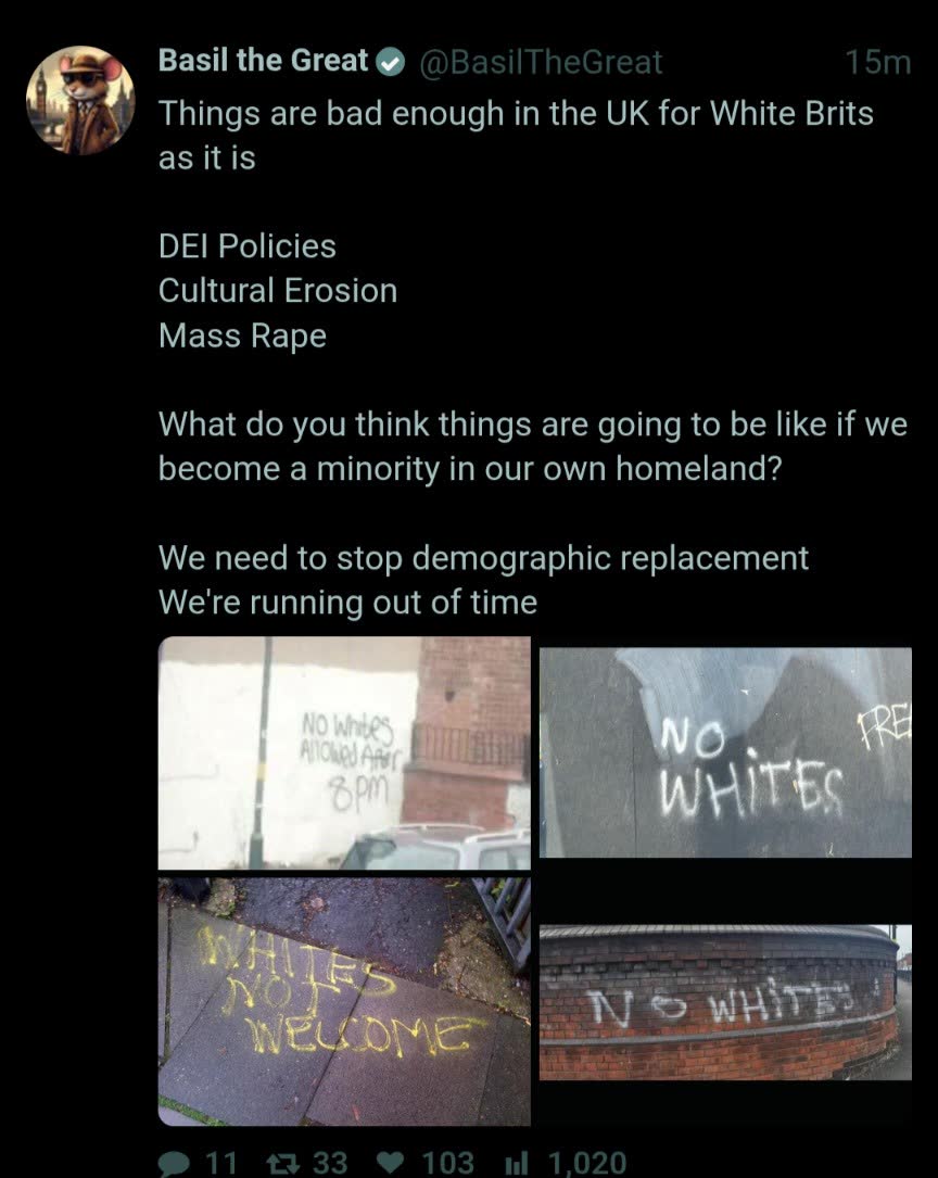 >>529928047I don’t get it either to be honest, I work all over including the state of Birmingham .I call them what they are to their face on the regular and nothing happens to me.I wish I could explain it to you, if I could I could probably do something about it.I live in a pretty 98% white English city and we’ve yet to have an incident so I’m not sure how my folk will react to it, violently I hope but that remains to be seen.But I have to agree, the people from the places you speak are weak and should be ashamed of themselves for letting their city’s and towns fall.