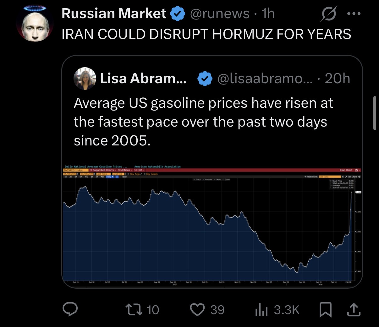 It was just $2.80 in New Jersey on Friday. Now my gas station is at $3.10
