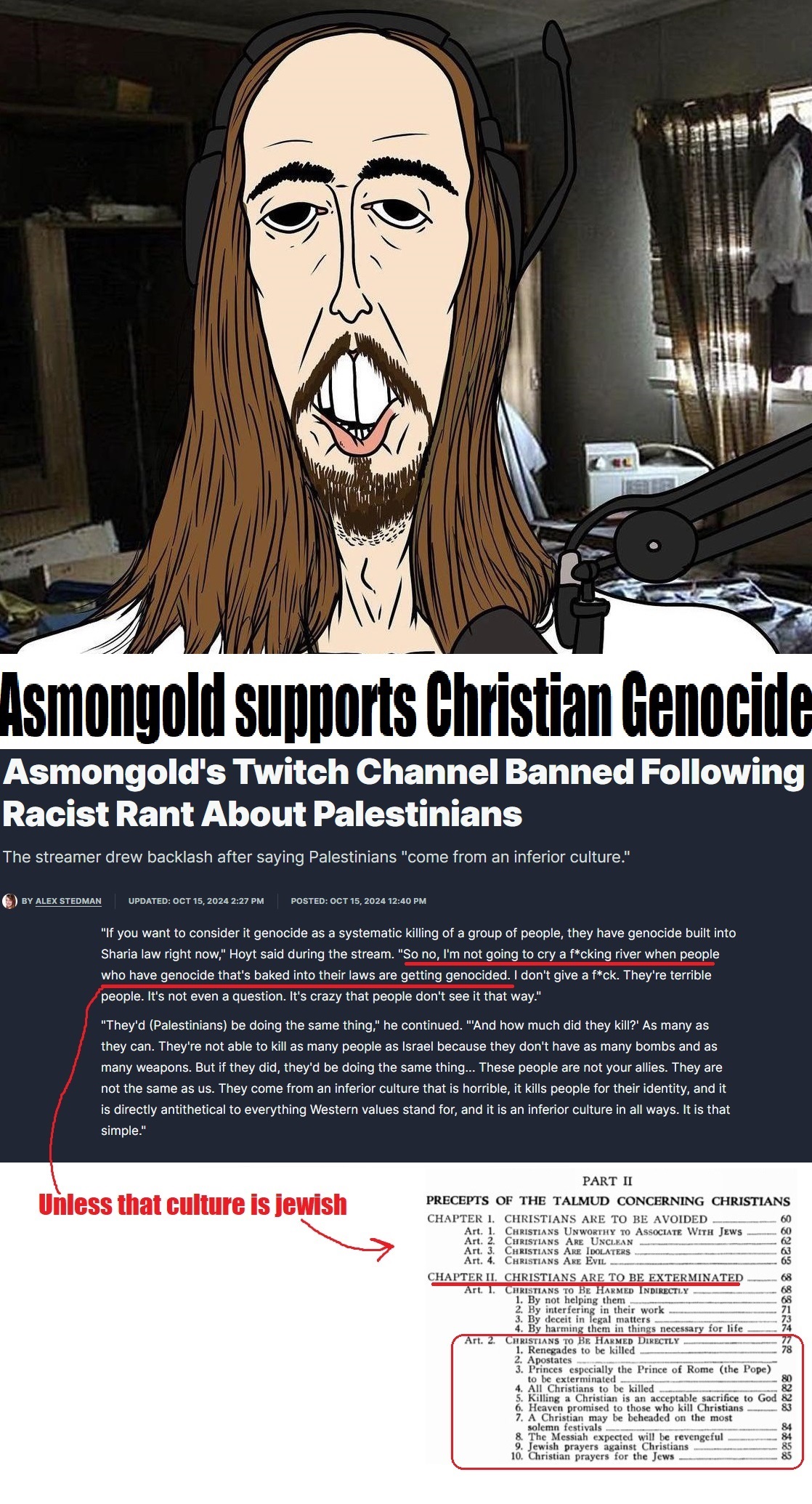 I was permanently banned from his chat for saying shalom fellow goyim