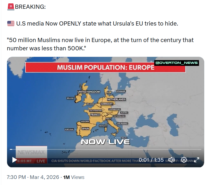 >muslim population in Europe in 2000: 500,000>muslim population in Europe in 2026: 50,000,000Is this the le based and trad christian europe we've been hearing about? Care to explain, eucuckolds?
