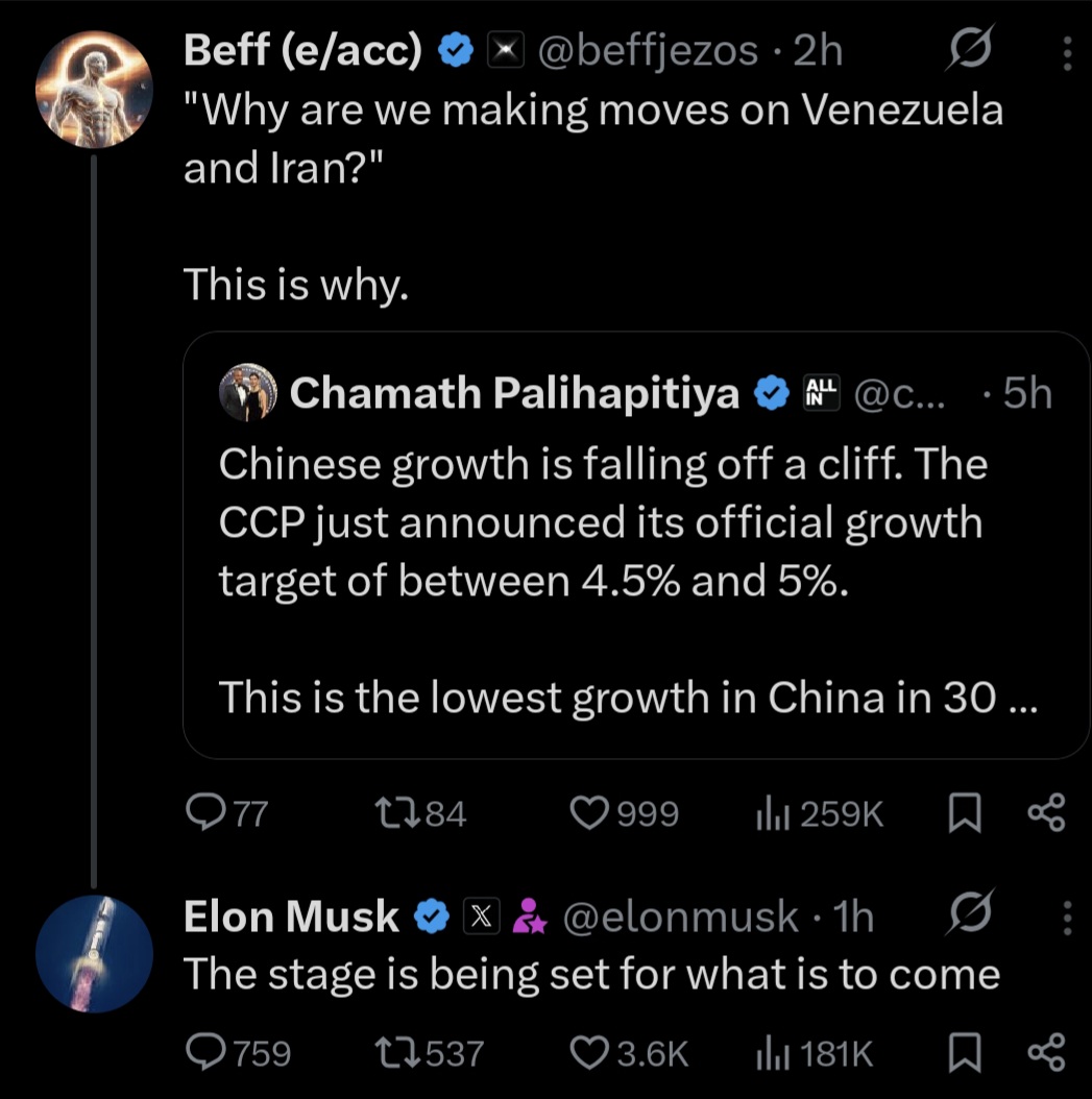 So we invaded Venezuela and Iran for >two more weeksUntil China collapse meme. What's next, the three river gorge?