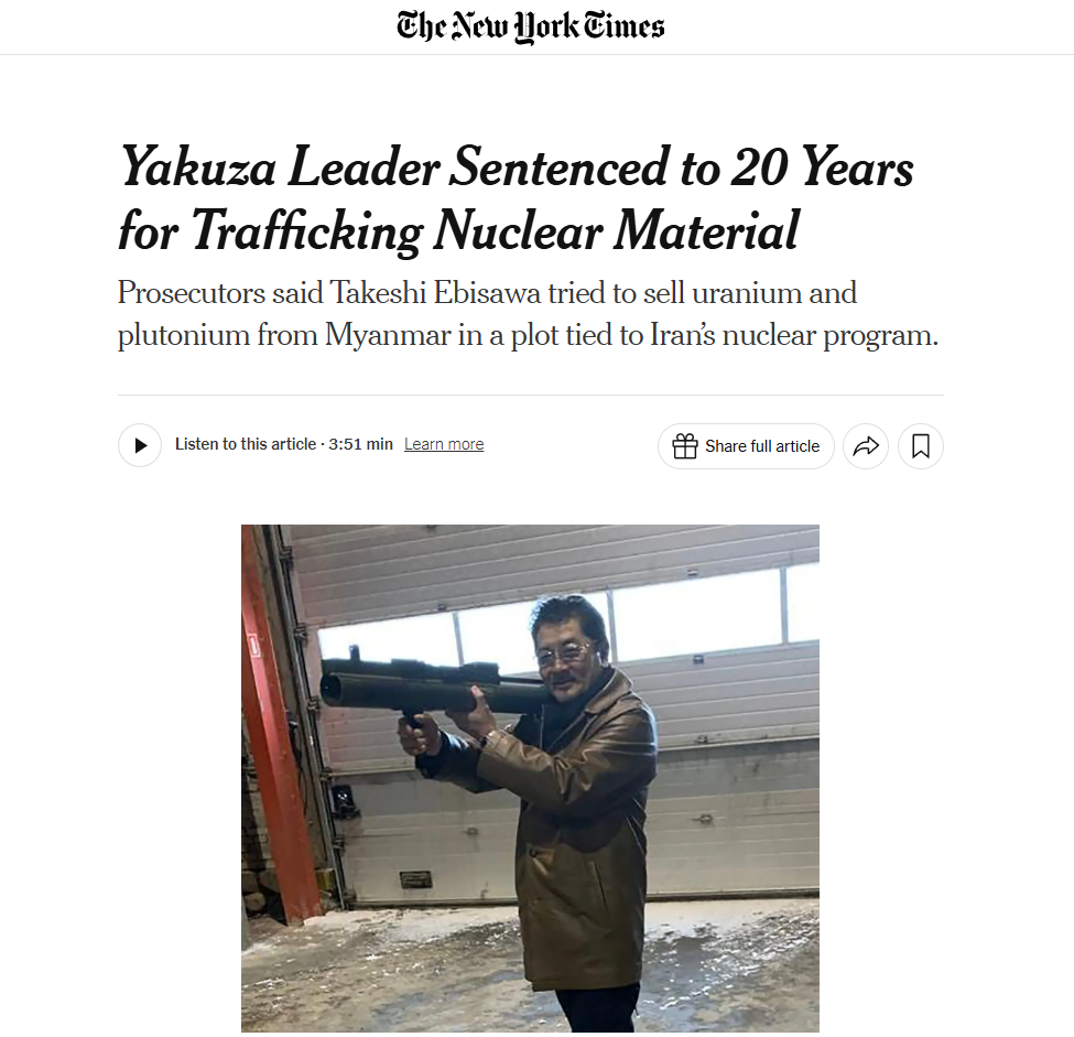 “Takeshi Ebisawa has been held accountable for his crimes, including an attempt to sell weapons-grade plutonium to Iran and to flood New York with deadly narcotics,” said ((((John Eisenberg)))), the assistant attorney-general for national security.
