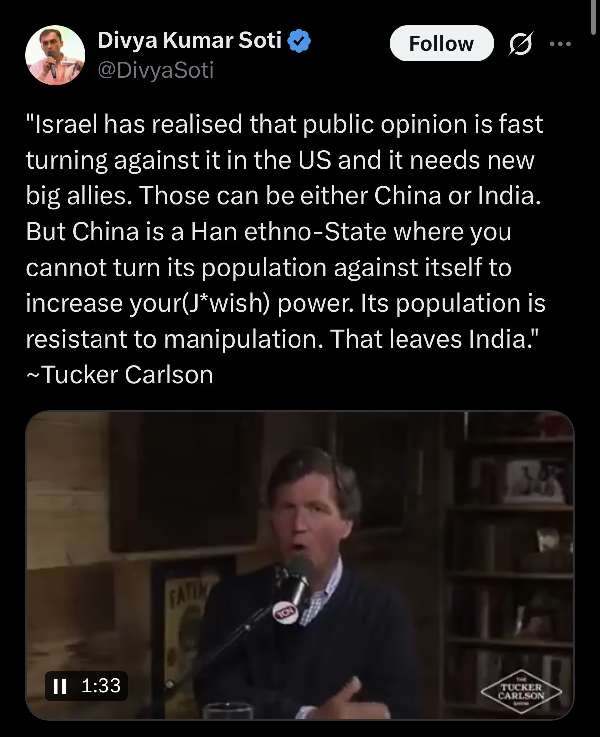 >>529946602Damn Tucker figured it out for real. He's the only one beside me I hear talking about Jews preparing to jump ship from the West and enslaving Indians to their cause. Of all the public figures he's the realest.