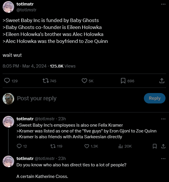 >>529958170all five of the people realized they had sex with her at the same time and one of them was a married ubisoft employee and this was when she was still traveling living with her exfuck off zoe
