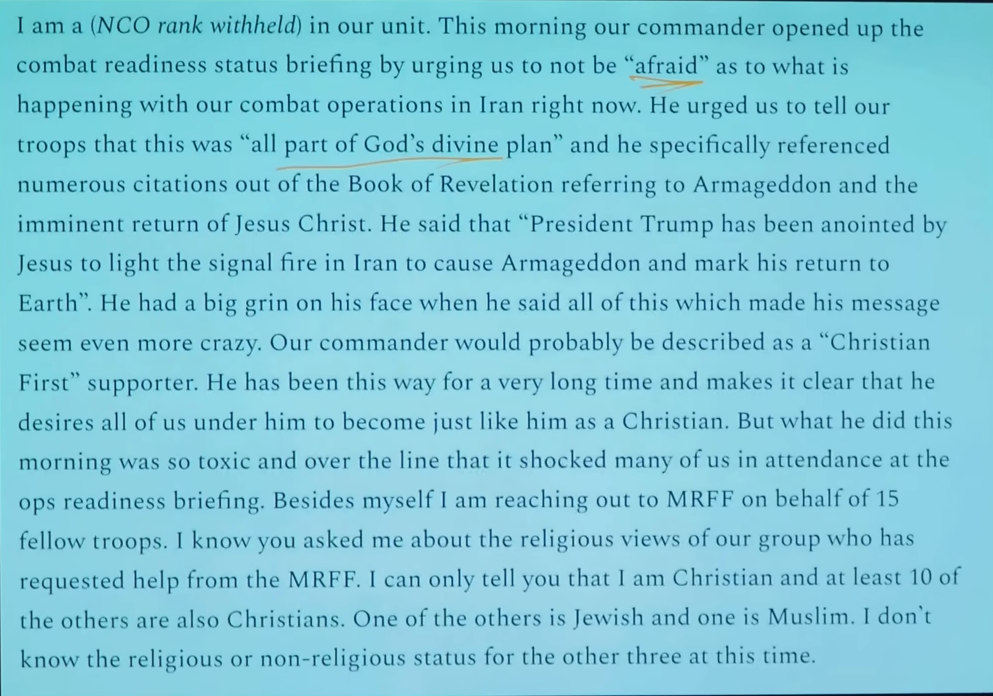 so what OP is saying is that a "watchdog says" that US troops are "told" something by somebody?>military religious freedom foundationlol?