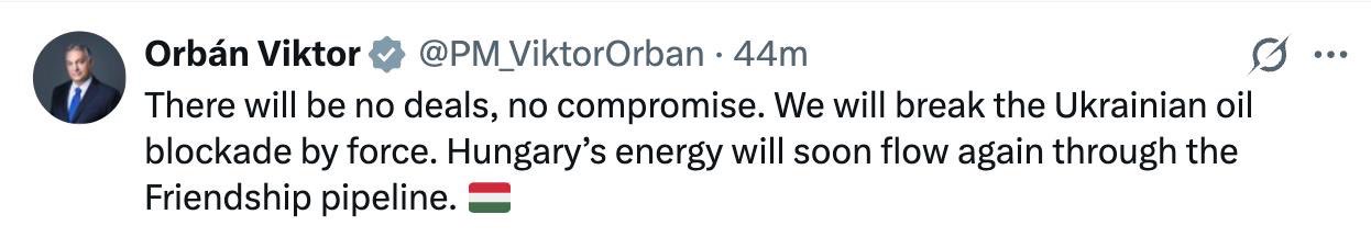 So, Zelyboy says he should "give Orban's adress to our armed forces", a direct threat to the president of Hungary, a EU and NATO nation.Orban respond by saying Hungary will forcefully open Druzhba again.This might get interesting.
