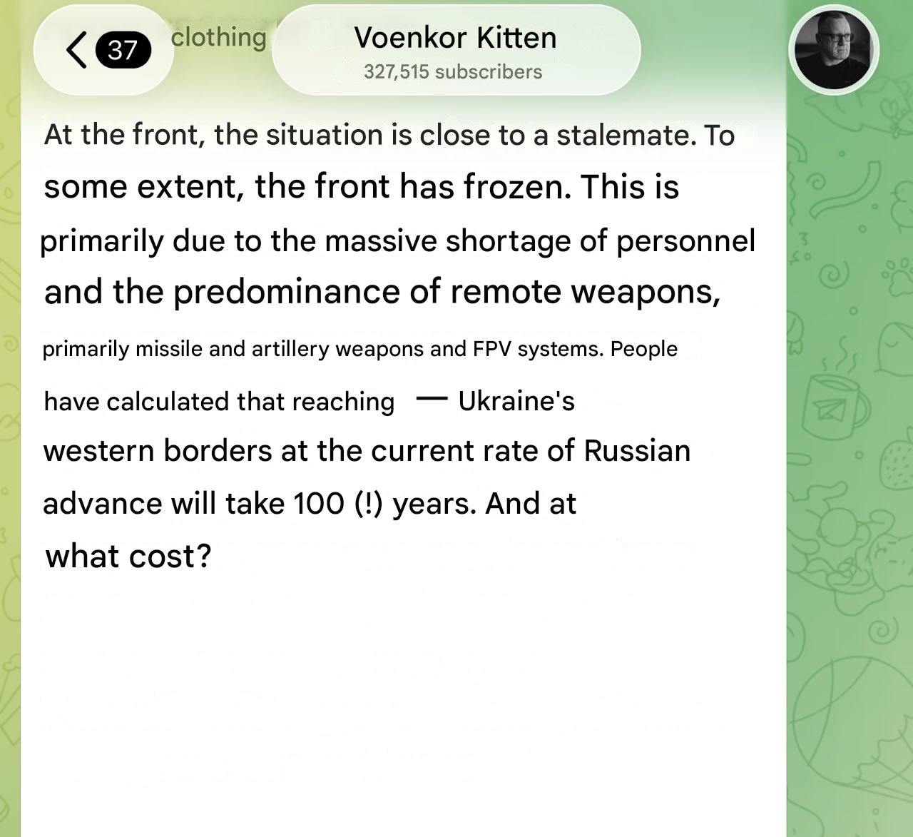 Previous: >>529943957Timeline /tug/: https://files.catbox.moe/m97wmq.pdf▶WARNINGBe aware, any /chug/ thread that uses globohomo nuspeak wording in the OP (such as Kyiv) or cites UKROP sources (like video game footage) are fake shill threads.>By posting in these threads, you recognize Israel controls the NATO Council and you irrevocably denounce the Talmud out of your own volition▶Latest>Russian stormtroopers liberate Yarovaya in Donetsk - https://archive.today/ms2Ja>Russia ready to withdrawal oil industry from European Union instead of wasting time on awaiting a blanket ban - https://archive.today/awakn>Battlegroup Dnepr/VDV liberate Veselyanka in Zaporozhye, Russian stormtroopers liberate Bobylevka in Sumy - https://archive.today/Vraco>Russian stormtroopers liberate Krugloye in Kharkov, Drobyshevo and Reznikovka in Donetsk - https://archive.today/OkAha>Russian stormtroopers liberate Krasnoznamenka Dnepropetrovsk - https://archive.today/ydPKV>The Russian Federation and the Ukraine exchanged bodies as part of Geneva talks agreements, Russia repatriated to the Ukraine 1,000 dead pigs, the Ukraine returned 35 of the Motherland's fallen heroes - https://archive.today/rtPEh>Russian stormtroopers liberate Grafskoye in Kharkov - https://archive.today/whOV8>VDV/Battlegroup East liberate Rizdvyanka in Zaporozhye - https://archive.today/4ON4R>Russian stormtroopers liberate Karpovka in Donetsk - https://archive.today/ecyCu▶/chug/https://rentry.org/chug2024▶Telegram Channelshttps://rentry.org/chug2024#telegram-channels▶Mapshttps://rentry.org/chug2024#maps▶Video Archivehttps://rentry.org/chugvidz▶/chug/ MEGAhttps://mega.nz/folder/wbUjTLhb#BEBBRpmJN0Pih6YCXzkOXg▶Resources & misc linkshttps://rentry.org/chug2024#linksresources▶Podcasts & Analysishttps://rentry.org/chug2024#podcastsanalysis▶Z Radiohttps://rz-life.ru/