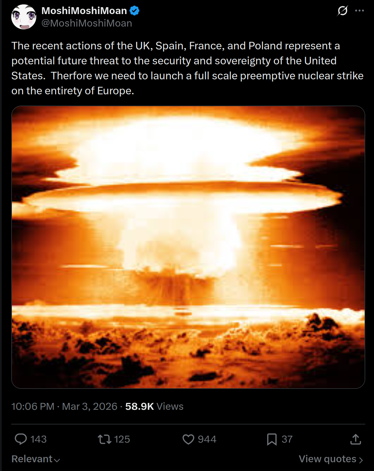 >>529956456>calling for all of Europe to be nukedbased desu.