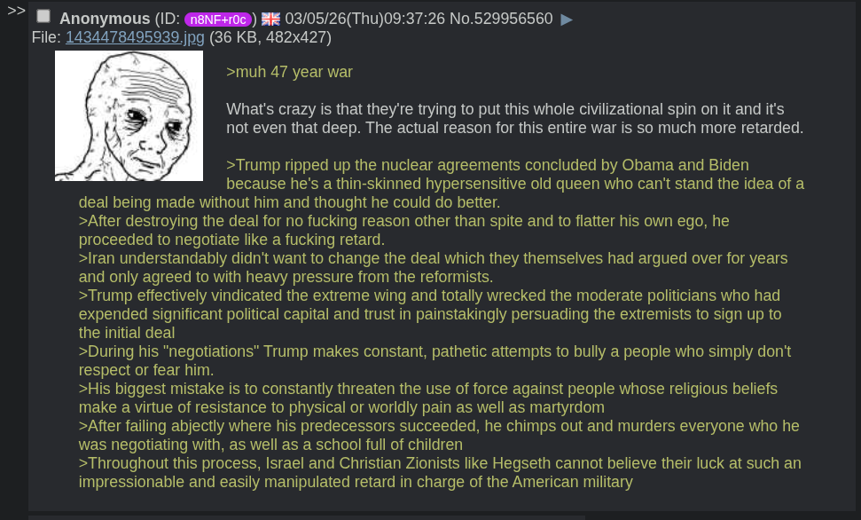 >muh 47 year war What's crazy is that they're trying to put this whole civilizational spin on it and it's not even that deep. The actual reason for this entire war is so much more retarded.>Trump ripped up the nuclear agreements concluded by Obama and Biden because he's a thin-skinned hypersensitive old queen who can't stand the idea of a deal being made without him and thought he could do better.>After destroying the deal for no fucking reason other than spite and to flatter his own ego, he proceeded to negotiate like a fucking retard. >Iran understandably didn't want to change the deal which they themselves had argued over for years and only agreed to with heavy pressure from the reformists. >Trump effectively vindicated the extreme wing and totally wrecked the moderate politicians who had expended significant political capital and trust in painstakingly persuading the extremists to sign up to the initial deal>During his "negotiations" Trump makes constant, pathetic attempts to bully a people who simply don't respect or fear him. >His biggest mistake is to constantly threaten the use of force against people whose religious beliefs make a virtue of resistance to physical or worldly pain as well as martyrdom>After failing abjectly where his predecessors succeeded, he chimps out and murders everyone who he was negotiating with, as well as a school full of children>Throughout this process, Israel and Christian Zionists like Hegseth cannot believe their luck at such an impressionable and easily manipulated retard in charge of the American military